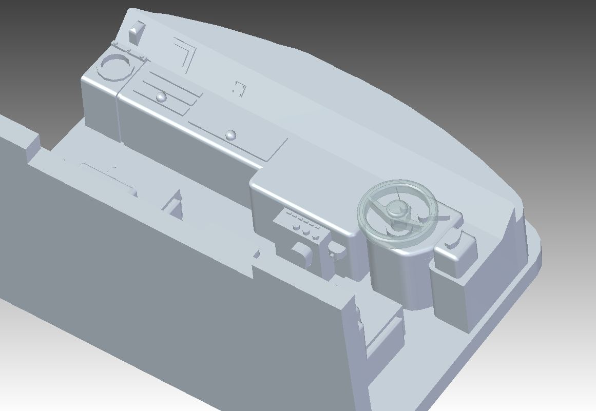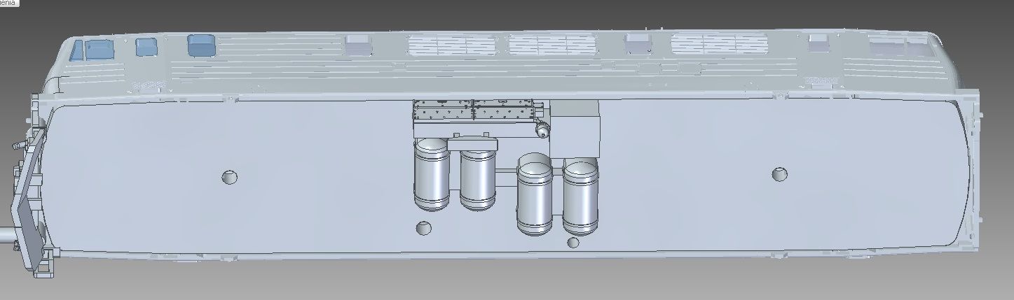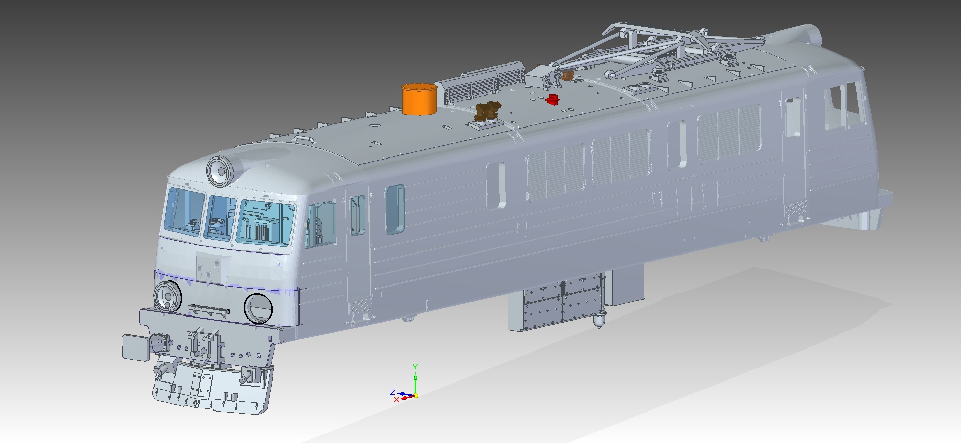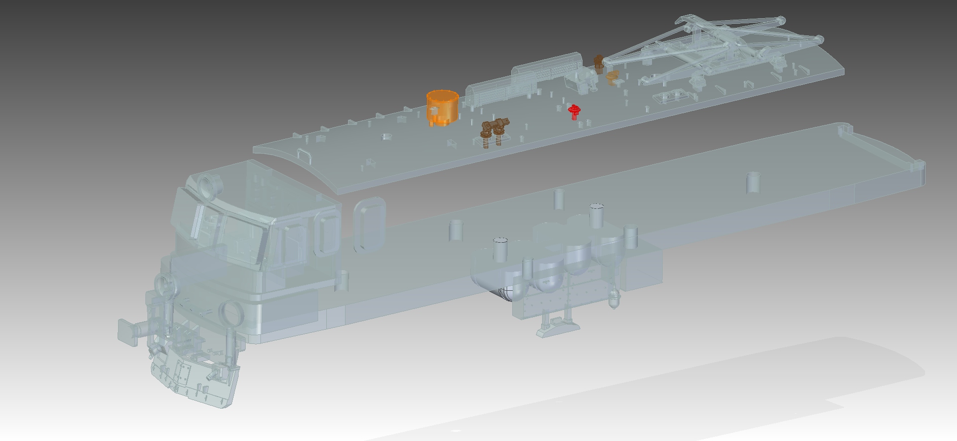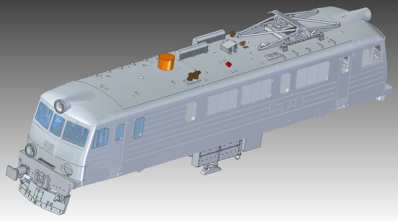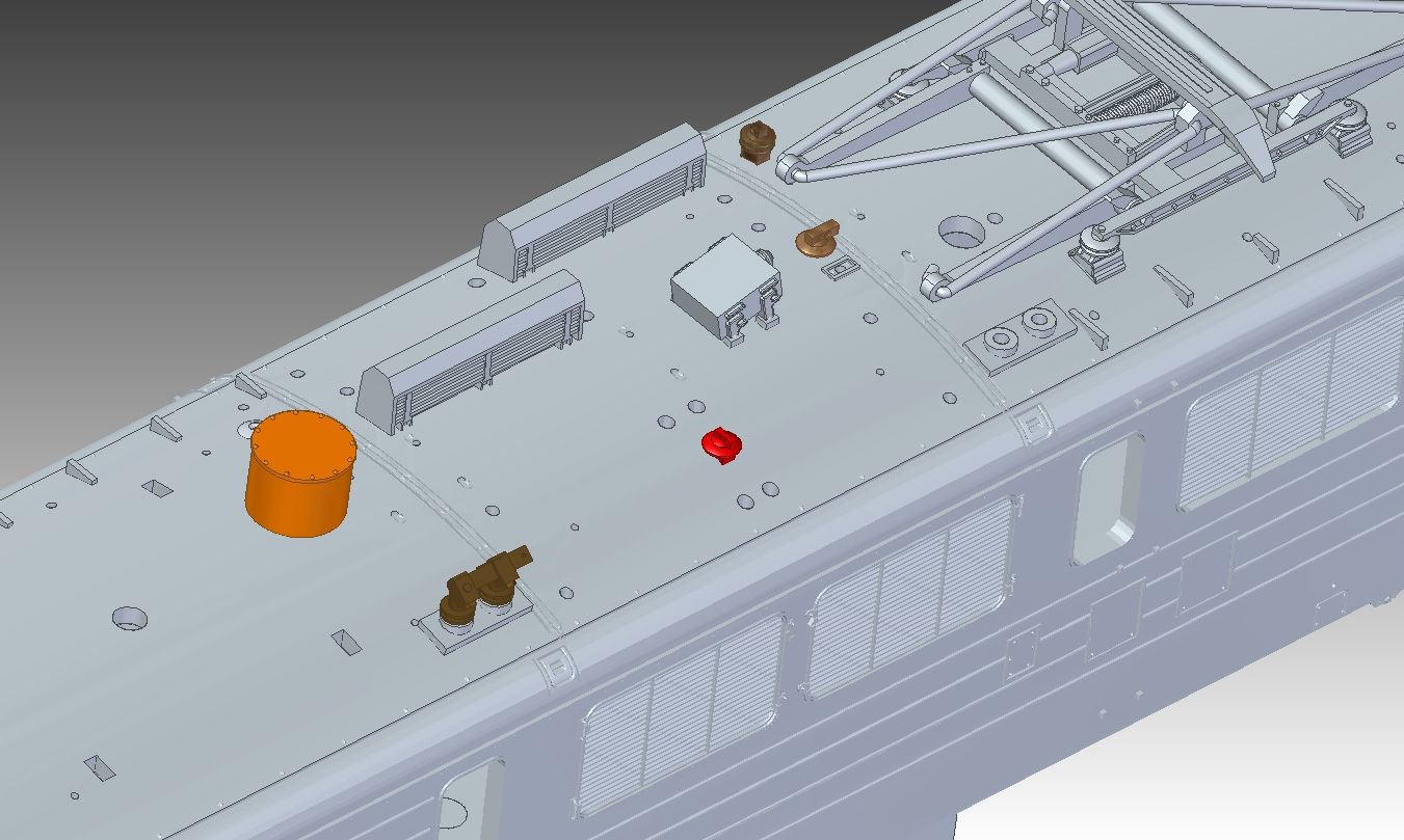 Dach, zabudowa oraz pantograf. Na zdjęciu nie ma wszystkich elementów, które się powtarzają. Zabieg ten jest użyty w celu nie obciążania pliku roboczego. Cała zabudowa dachu z mosiądzu oraz srebra odlewniczego jeśli mosiądz okaże się zbyt ziarnisty.