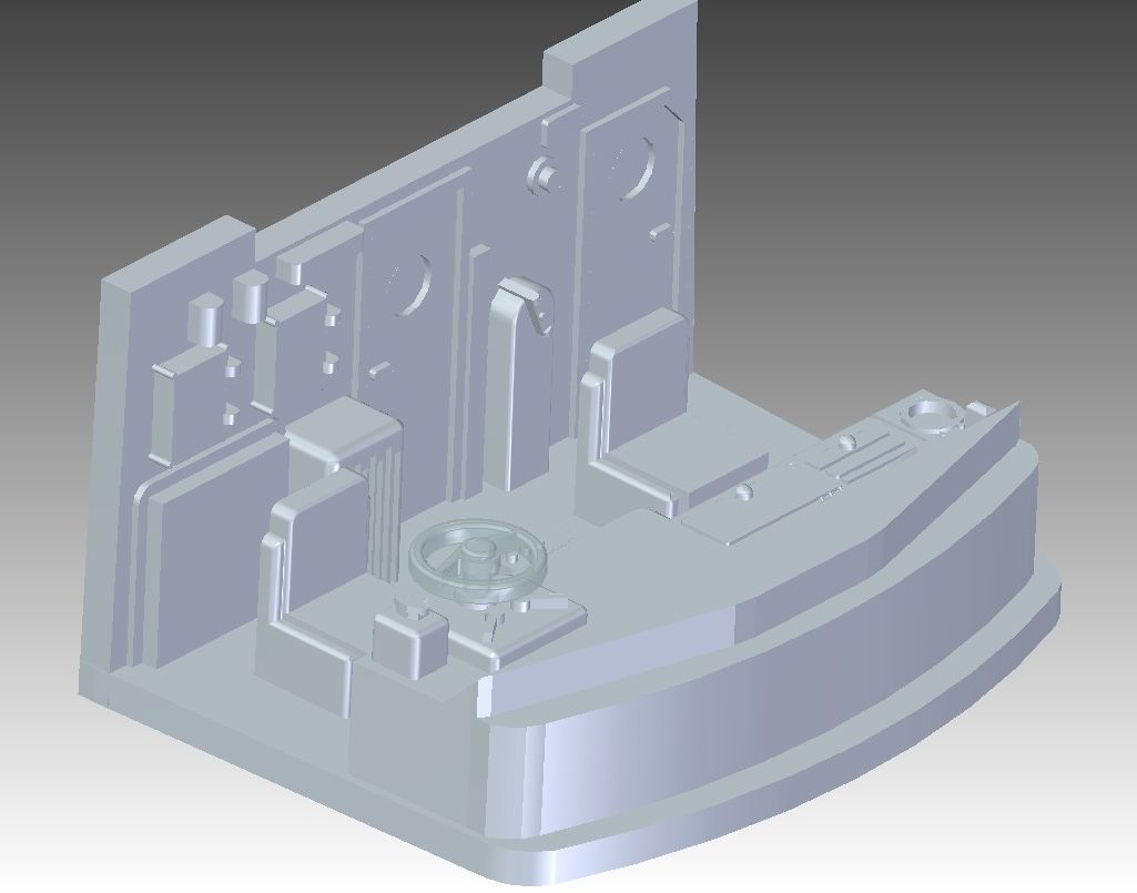 Rama, podłoga, zabudowa ramy. Monolit z mosiądzu lub innego metalu wycięty wodą. na zdjęciach gniazda wózków jeszcze w postaci otworków ale w wersji produkcyjnej znajdzie się otwór pod napęd wybrany przez zamawiającego – Tillig lub Piko.