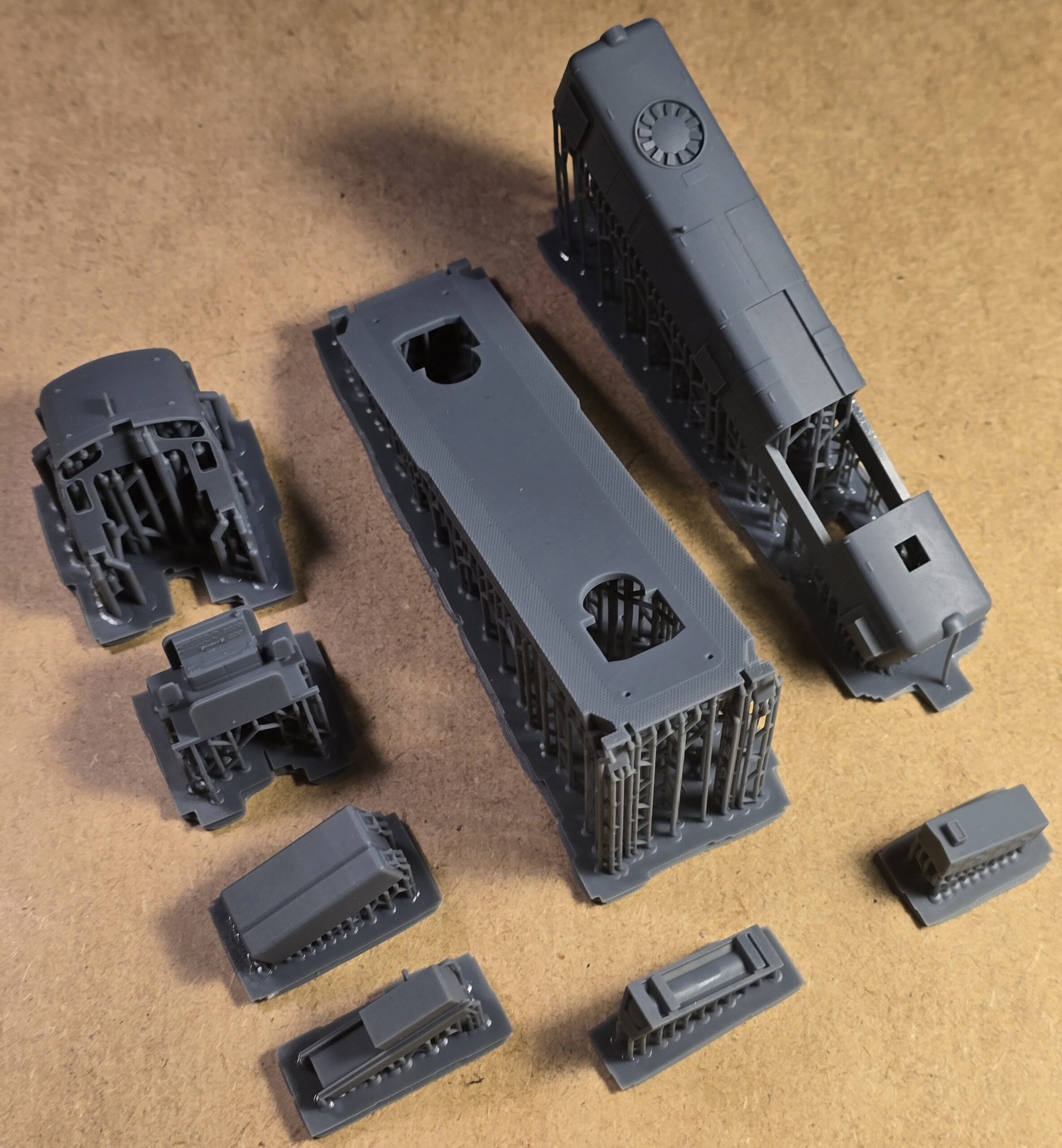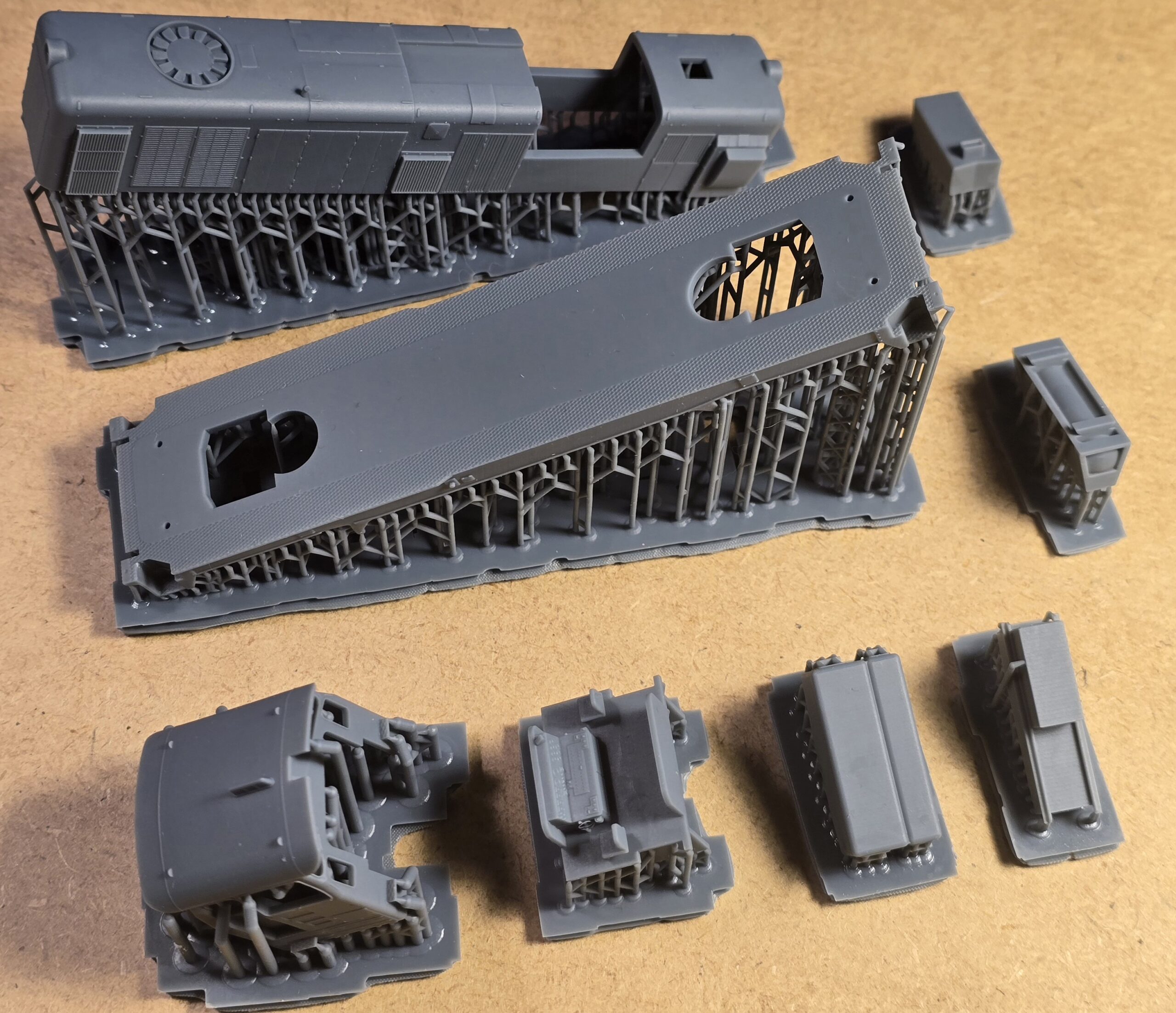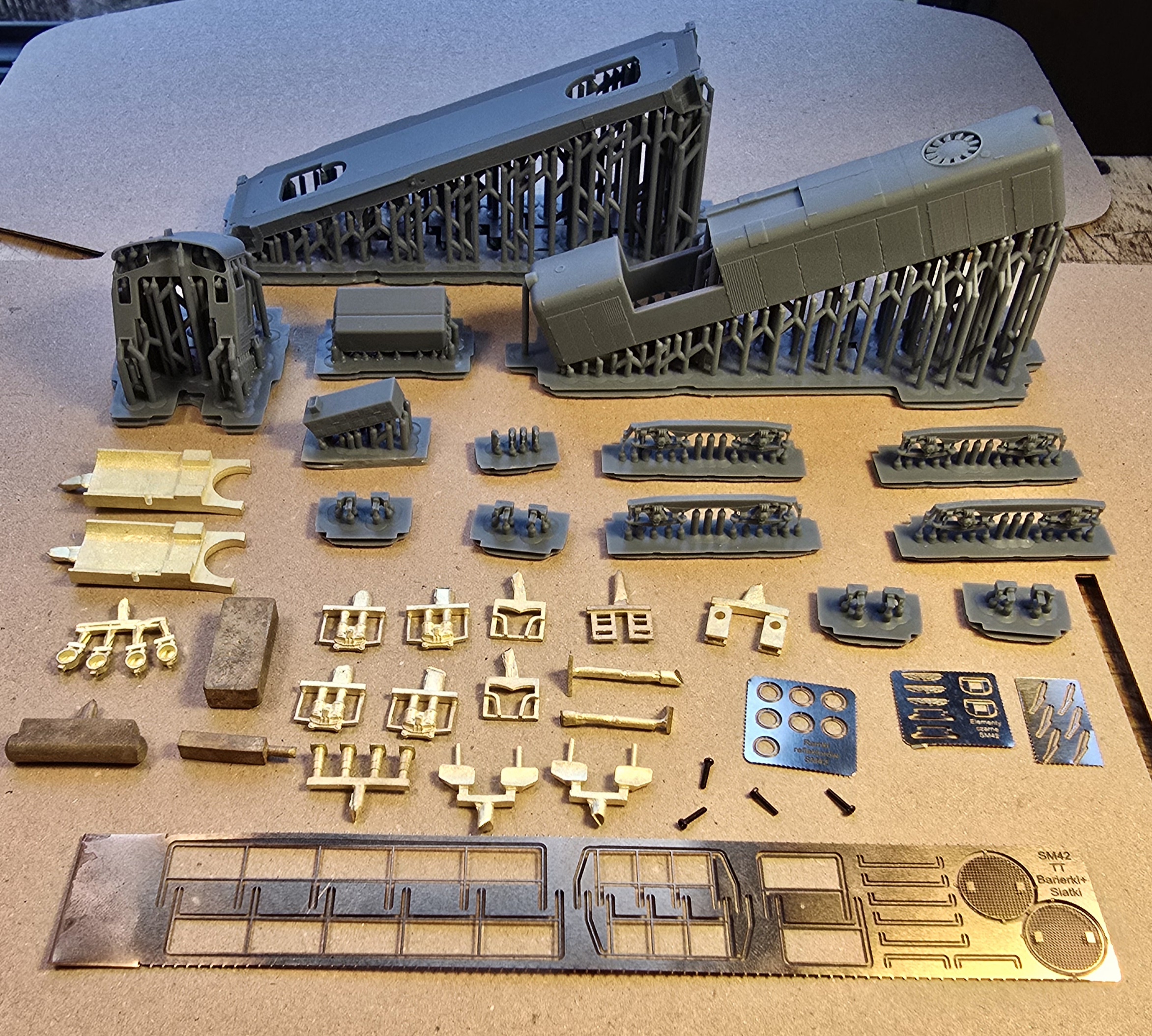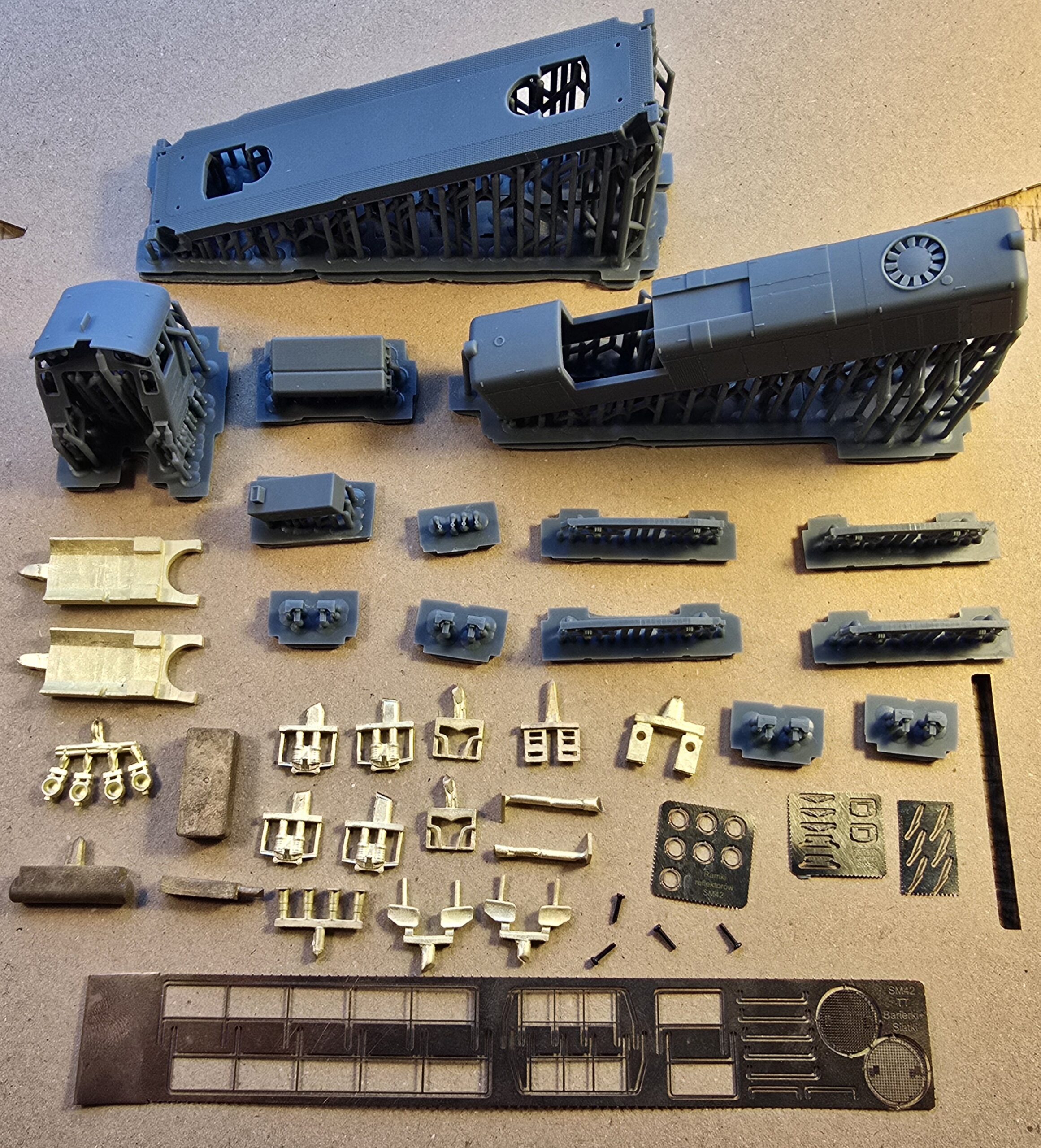 – wydruki 3D (rama, wózki boczki plus piasecznice, przedział maszynowy, budka maszynisty, tłumik/i, zbiorniki ramy/zbiornik ramy ze zbiornikiem powietrza (SP42) , odbłyśniki reflektorów, trąbki, wnętrze kabiny)